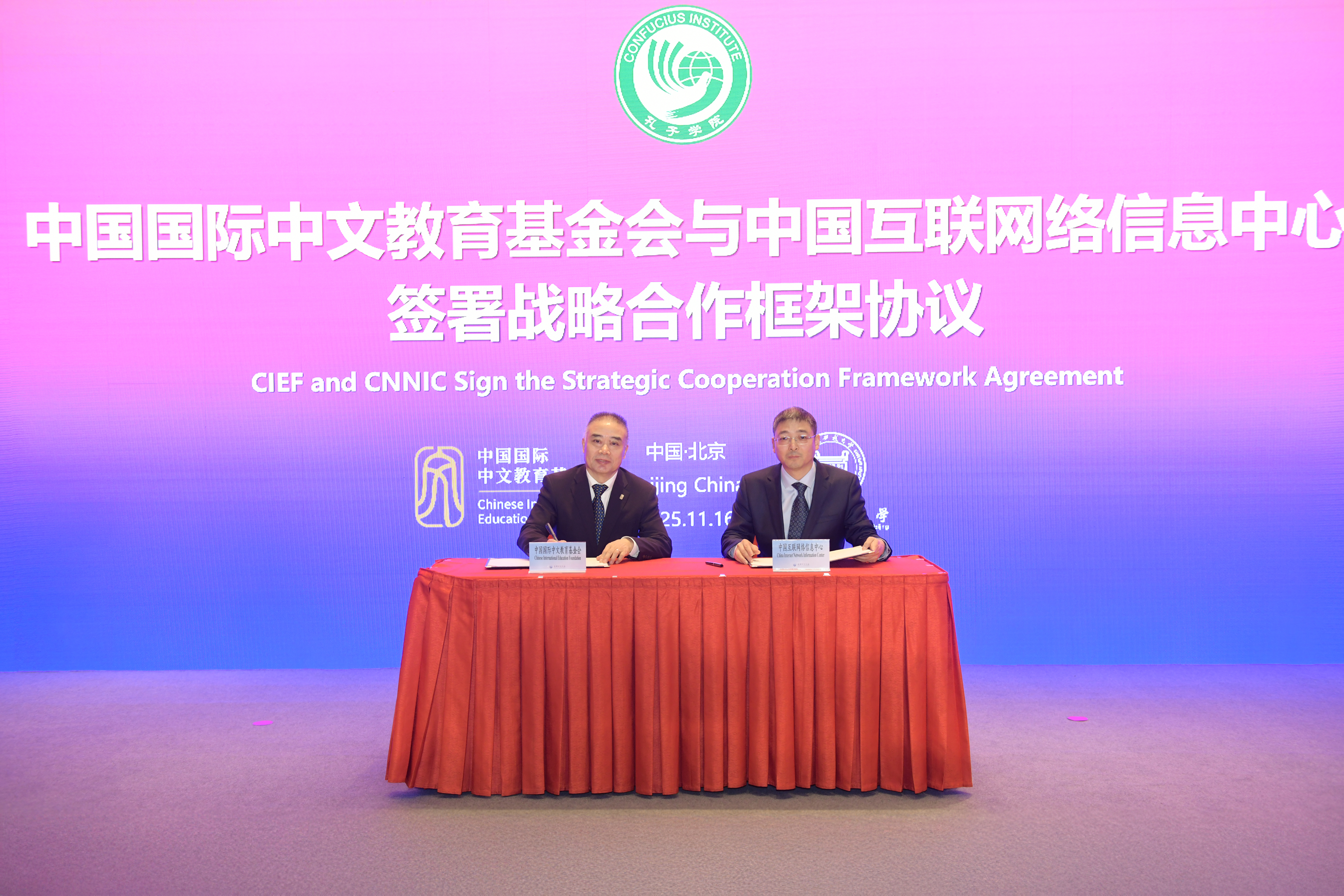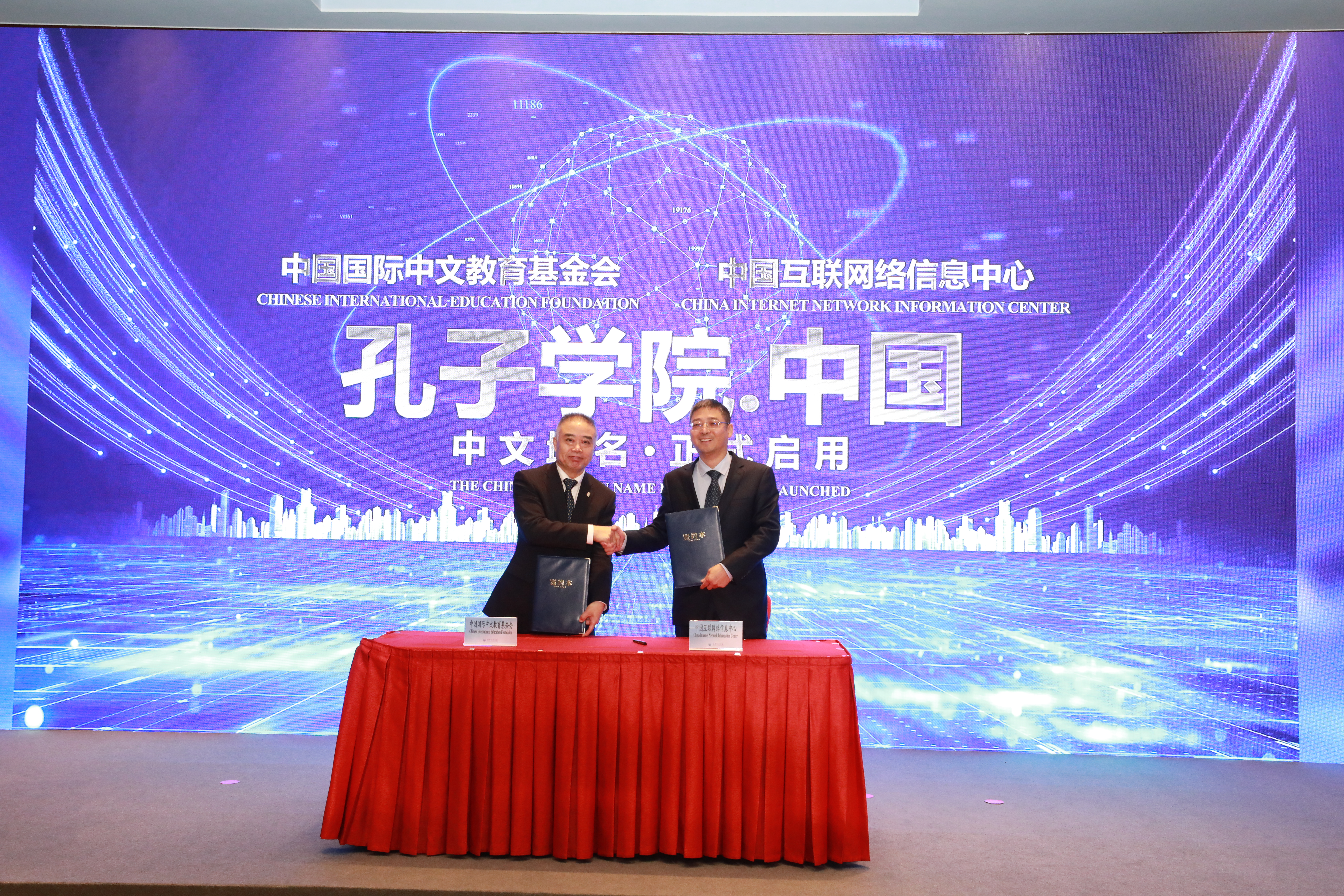 会议现场,中国国际中文教育基金会与中国互联网络信息中心举行了战略合作框架协议签约仪式,正式启用了孔子学院全球门户网站(ci.cn)的中文域名“孔子学院.中国”。